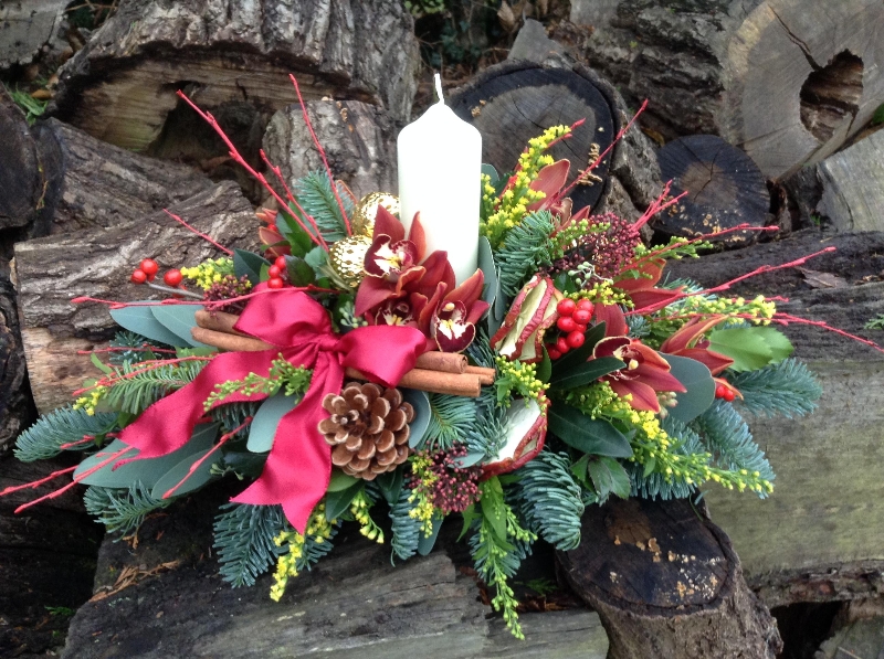 Treat yourself for Christmas or send as a gift, this beautiful table centre with Cymbidium orchids, blue spruce, Holly, cones, cinnamon and dried apple slices will put the finishing touch to your Christmas table.