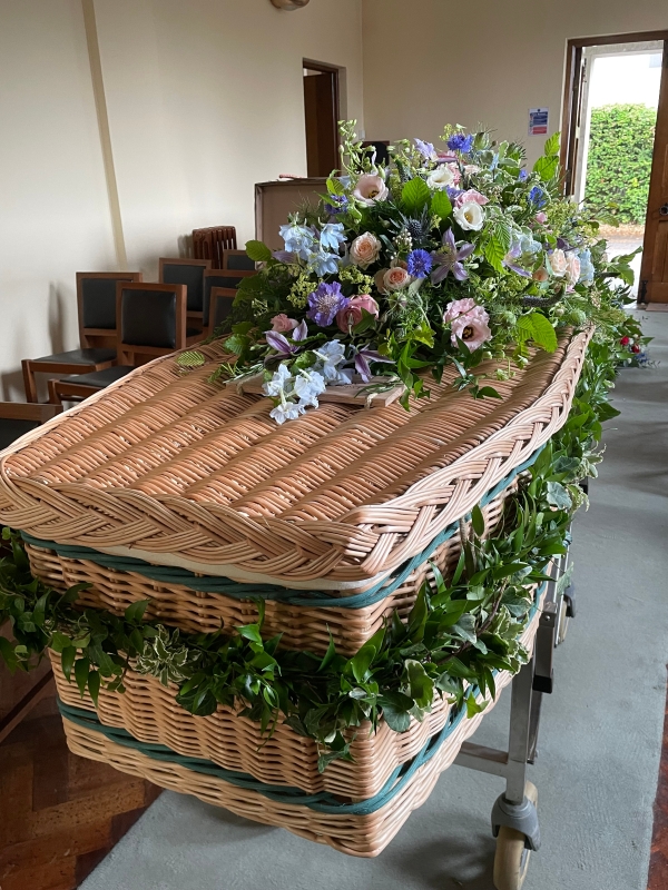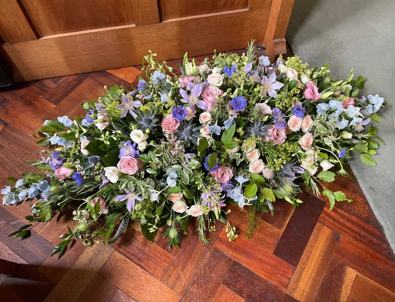 Soft and feminine double ended funeral spray in pastel shades with pink roses and summer flowers in pink, lilac, white and green.