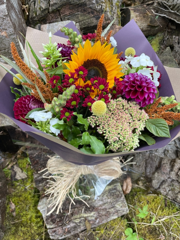 A hand tied bouquet in rich jewel tones with Late summer and autumnal flowers including long lasting Santini chrysanthemums. Flowers may vary from those shown our florist will choose a combination of the freshest blooms to create an individual design especially for you.