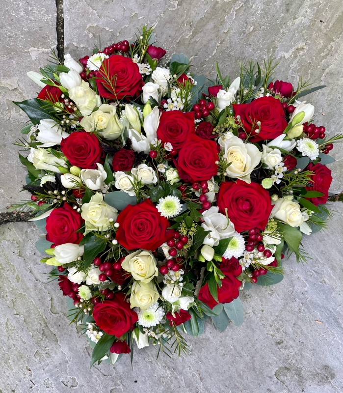 Small red and white heart with roses berries and freesia. This tribute is made on a 30cm frame.