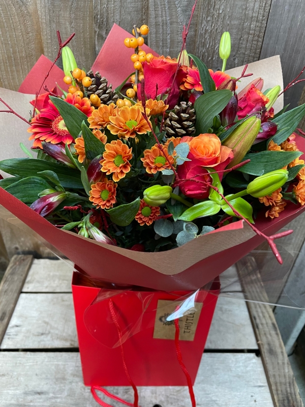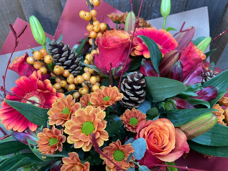 Red twigs and pine cones with Christmas foliage are included in this lovely mixed bouquet in warm shades of red and orange.