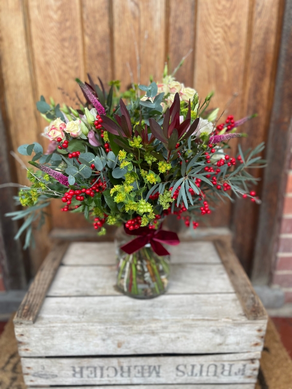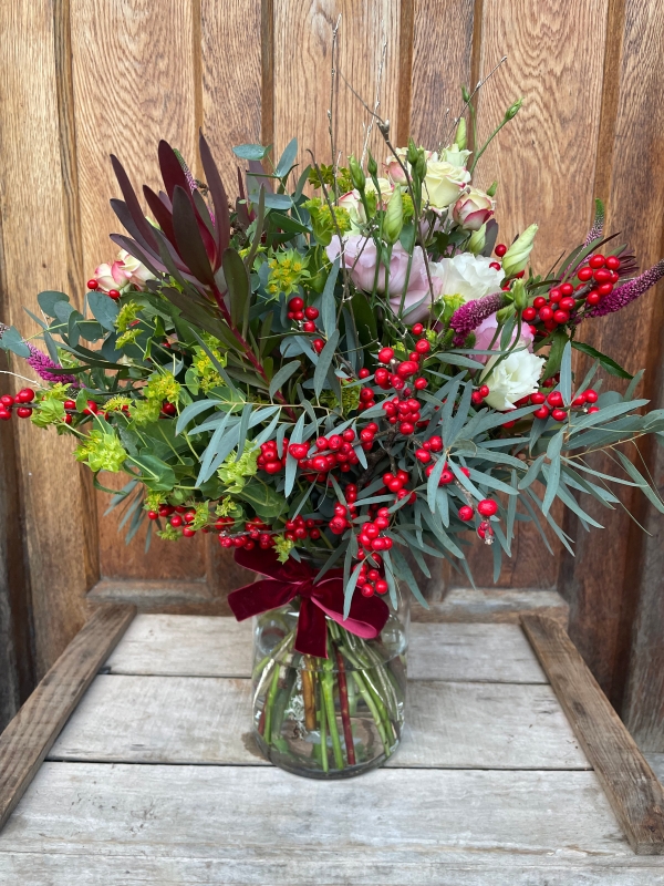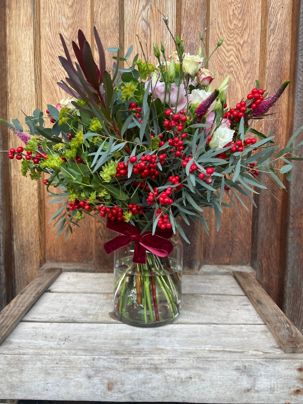 A mixed selection of seasonal mixed foliage, pink Lisianthus,
