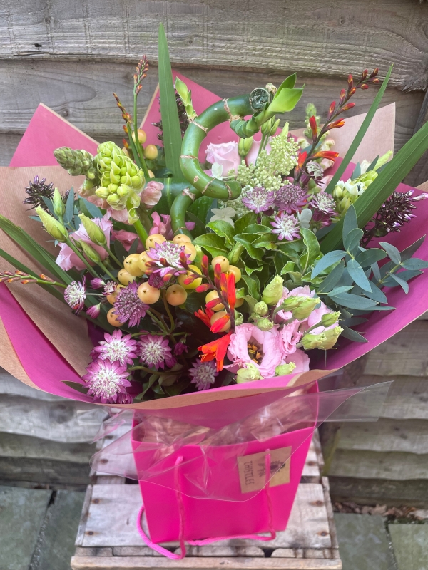 This months bouquet features Antirrhinum, Pink Lisianthus and berries with a stem of curly Dracaena.