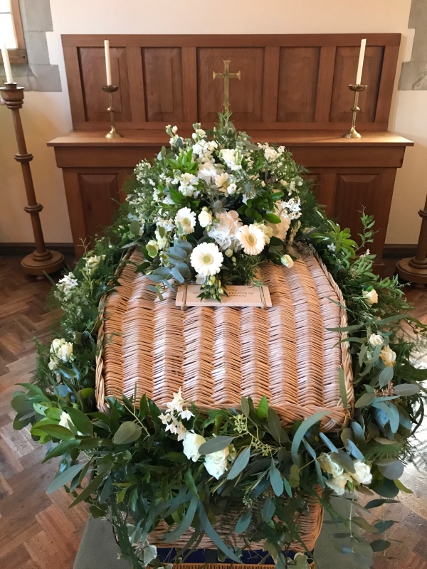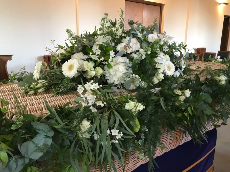 A selection of white flowers including roses and Lisianthus arranged in a loose garden style using a mixed selection of beautiful seasonal foliage.